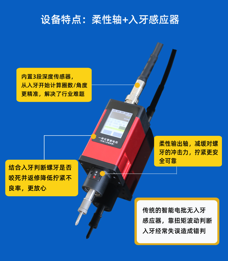 一體化智能電批特點(diǎn): 一件頂三件 柔性輸出軸,內(nèi)置深度傳感器 智能學(xué)習(xí)模式,無需繁鎖設(shè)置,內(nèi)置工藝應(yīng)用 網(wǎng)口串口通訊全覆蓋,多任務(wù)多模式